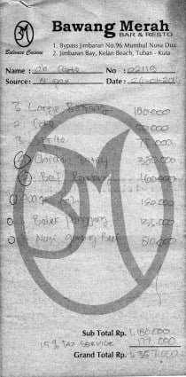 bill 26 Jan 2016 8pax – food IDR109,000/pax SG$11 Bawang Merah Jimbaran Bay29 January 201629 January 2016 « Previous Next »